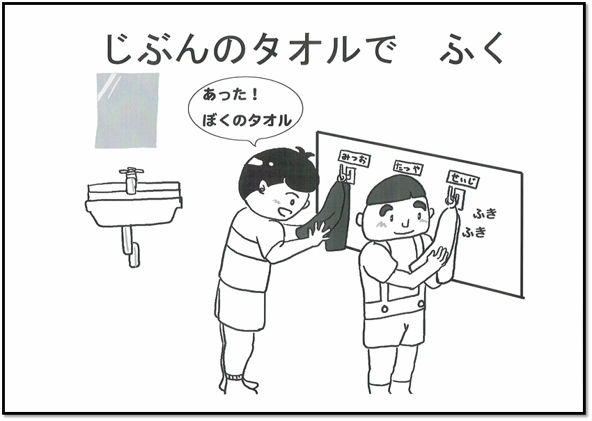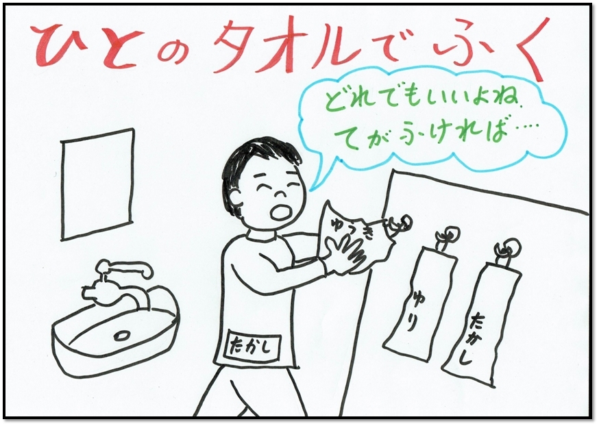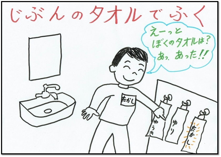 よくわかったね。そのとおり。じぶんのタオルをさがしてつかおうね。ひとつまえにもどる トップページにもどる