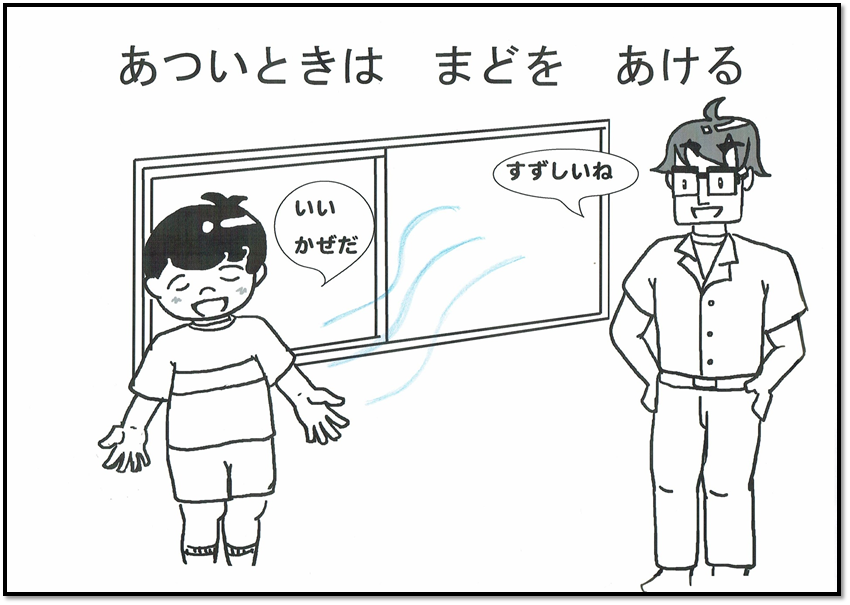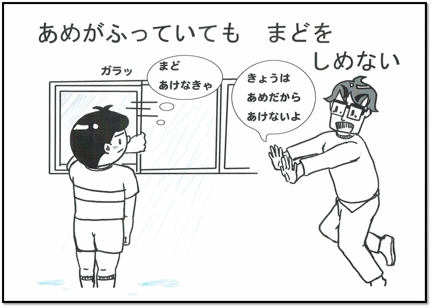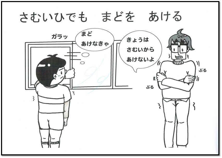 あれれ?さむいのにまどをあけるの?いつでもおなじようにあけるのは、ちょっとこまるな・・・。ひとつまえにもどる トップページにもどる