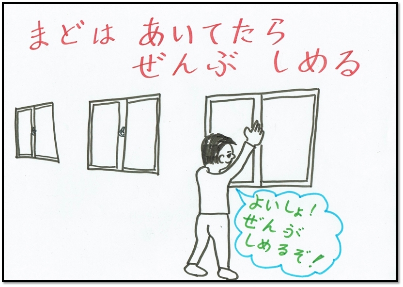 やった!せいかいです。かぜがきもちいい!まどは、ぜんぶしめなくていいんだよ!ふだんはそのままでいいよ。ひとつまえにもどる トップページにもどる