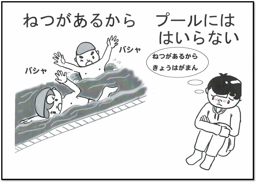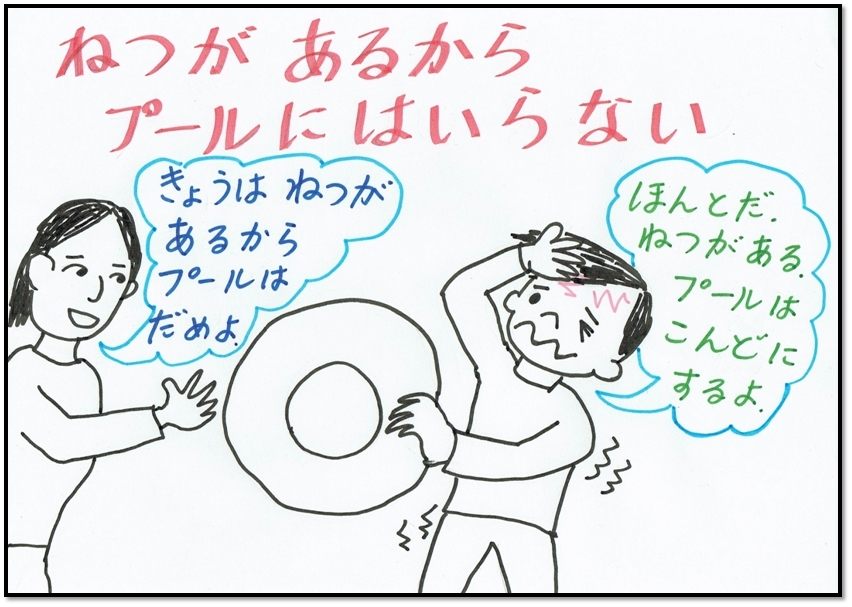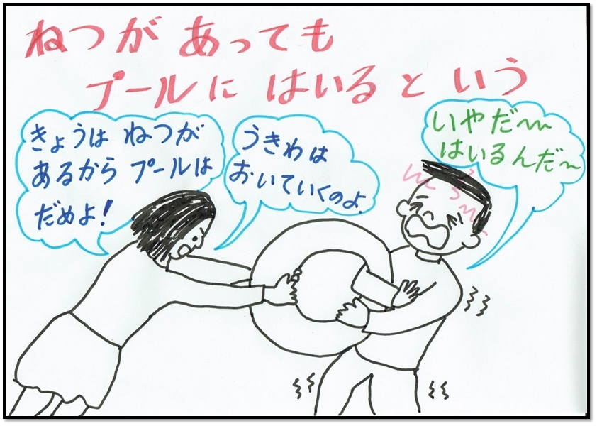 あれれ?こっちがかしこいかな?ねつがあるのに、プールなんかはいったらもっとしんどくなるよ!プールはまた、こんど!ひとつまえにもどる トップページにもどる