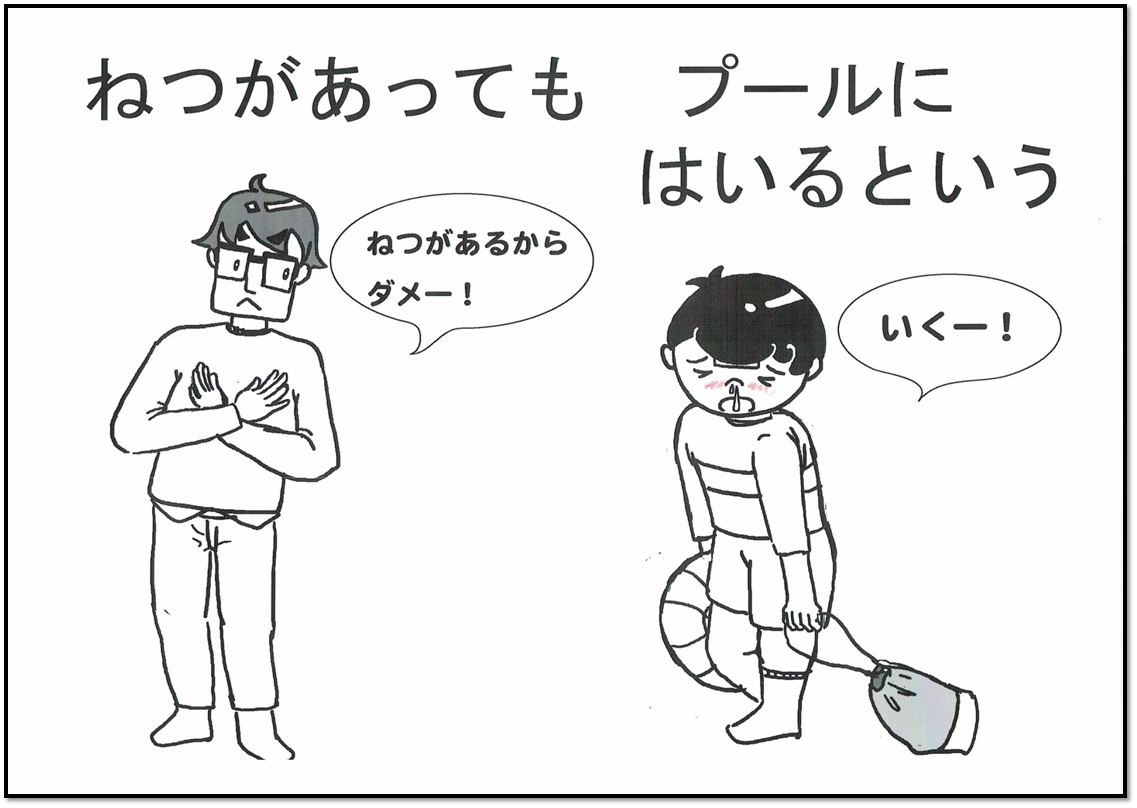 やったあ!せいかいです。ねつがあったら、むりせずにプールはやすもうね!ひとつまえにもどる トップページにもどる