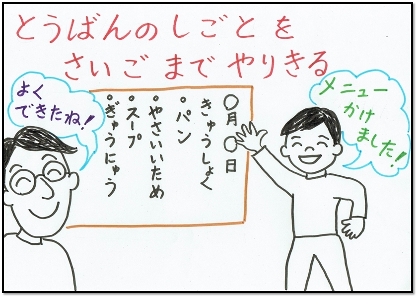 あれれ?なんからくがきしてあそんでる。とうばんのしごとでしょ?さいごまで、メニューをかいてね。ひとつまえにもどる トップページにもどる
